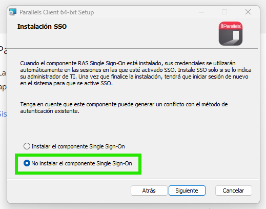 Haremos click directamente en ‘Siguiente’ (por defecto, debe estar seleccionada la opción de ‘No instalar el componente Single Sing-On’).