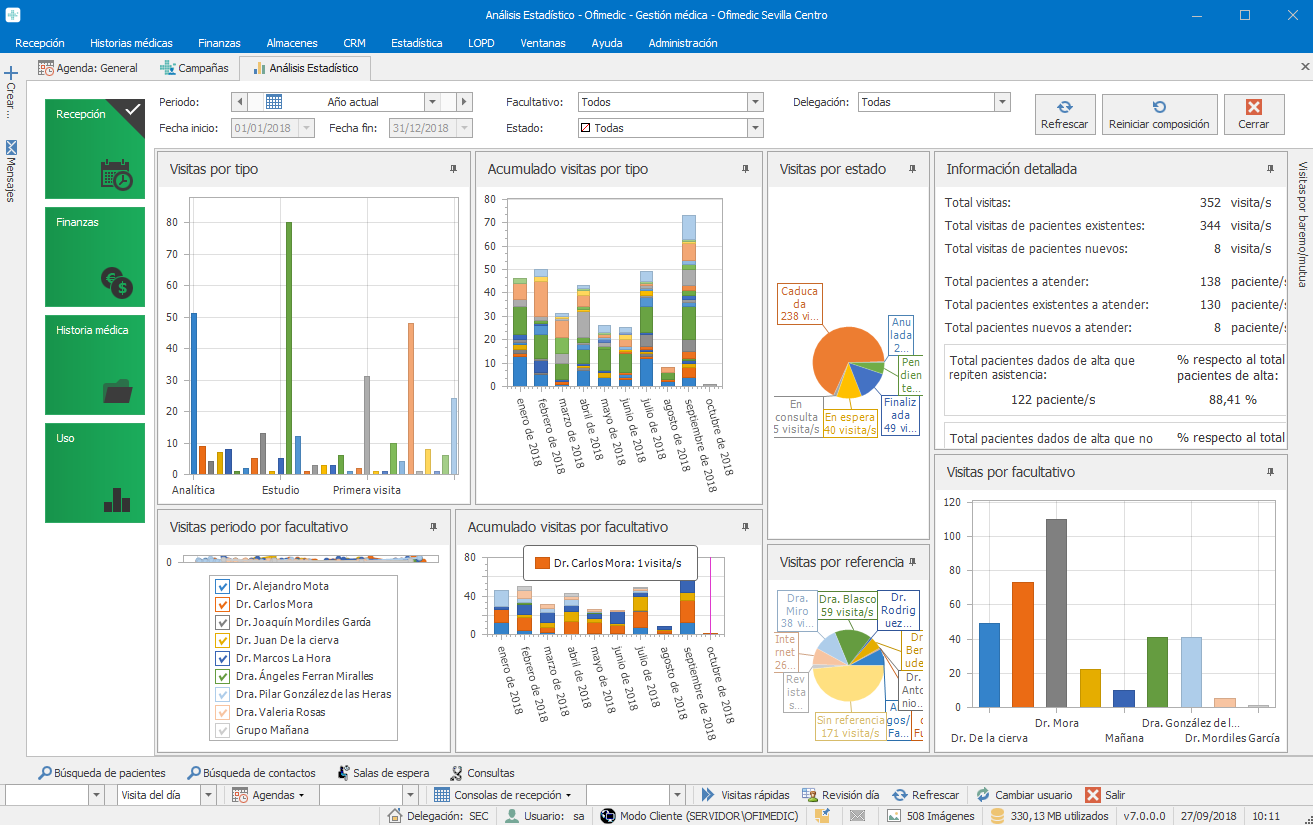 - Informes de actividad: Resumen total de todo lo que ocurre en su consulta en un periodo de tiempo: Altas, visitas, actos médicos, ventas,… todo ello agrupado por conceptos varios, con gráficas, porcentajes...