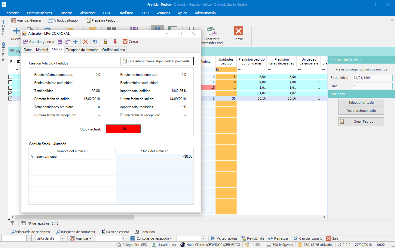 Opciones en Ofimedic para controlar sus stocks de productos, almacenes y pedidos:
